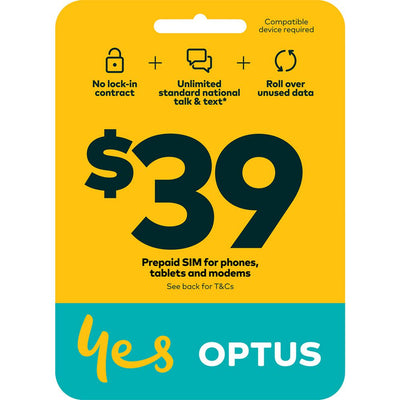 SIM Starter Kit: Includes $39 recharge. New services only. Expiry and inclusions will depend on your plan, seeoptus.com.au/prepaidplans. Data Rollover: Requires recharge before expiry.